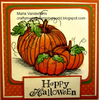- The image of the 3 pumpkins (non SU) was stamped with Memento ink onto Whisper White cardstock and coloured with copic markers. I love colouring, and can sit and do that activity all day long.