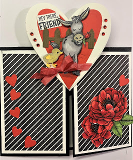 The Gate fold base is Basic Black card stock 4 1/4 by 11" scored 2 3/4" at each end. The front panels are layered with Whisper White and then a black and white diagonal stripe DSP called "True Love". A sprinkle of Poppy Parade hearts cascade down the right panel; red flowers fussy cut from the same DSP as the diagonal stripes (and coloured with Blends) grace the left panel.The art piece that slides up and down in the space between the Gate folds is heart shaped - a larger Whisper White heart with a smaller Poppy Parade heart added to it. A Donkey, from "Darling Donkeys" with a rose in his mouth, was stamped, coloured with Blends, and then fussy cut. Using dimensionals, he was added to the heart in front of a die cut fence from "Birthday Chick Dies". I also added a cute little die cut chick from the same die set.